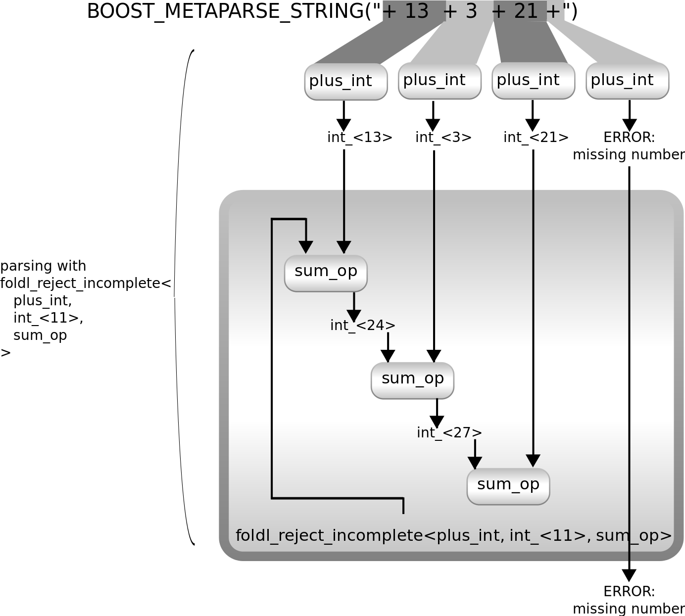 #include <boost/metaparse/define_error.hpp> #include <boost/metaparse/repeated1.hpp> #include <boost/metaparse/letter.hpp> #include <boost/metaparse/int_.hpp> #include <boost/metaparse/token.hpp> #include <boost/metaparse/sequence.hpp> #include <boost/metaparse/change_error_message.hpp> #include <boost/metaparse/start.hpp> #include <boost/metaparse/get_message.hpp> #include <boost/metaparse/string.hpp> #include <type_traits> using namespace boost::metaparse; BOOST_METAPARSE_DEFINE_ERROR(age_expected, "Age expected"); using name_token = token<repeated1<letter>>; using age_token = token<change_error_message<int_, age_expected>>; using name_age = sequence<name_token, age_token>; static_assert( std::is_same< age_expected, get_message<name_age::apply<BOOST_METAPARSE_STRING("Joe "), start>>::type >::type::value, "the error message should be age_expected when the age is missing" );